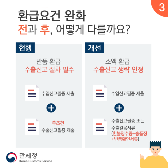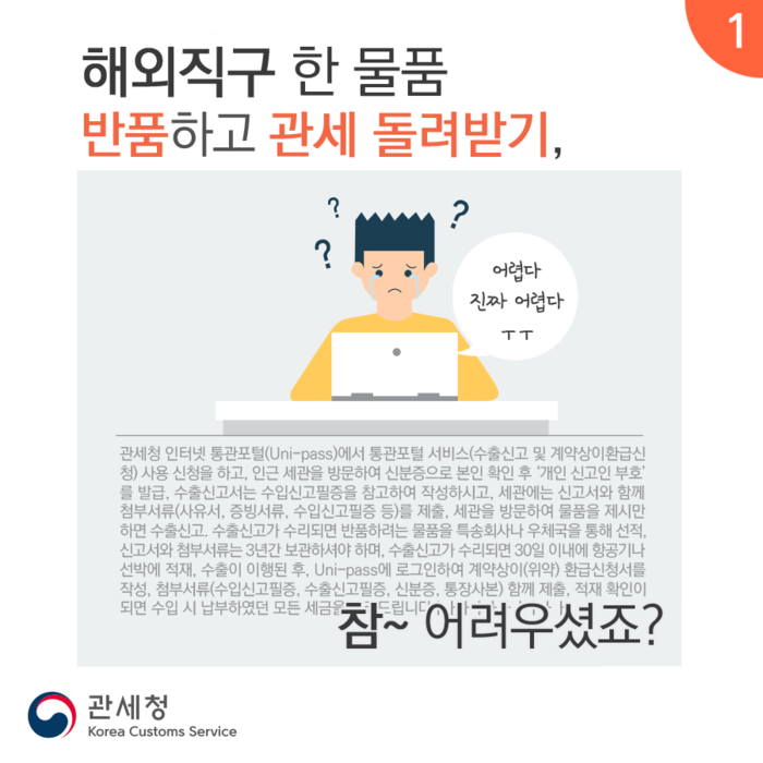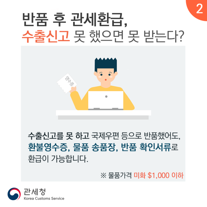 단순변심, 사이즈 상이 등에 따라 해외직구한 물품을 반품하는 경우 그동안은 세관장에게 수출신고를 한 후, 수출신고필증을 제출해야만 세금을 돌려받을 수 있었다. 앞으로는 수출신고를 못하고 국제우편 등으로 반품한 경우에도 운송 확인서류, 반품 확인서류 및 환불영수증으로 관세환급이 가능하게 된다.