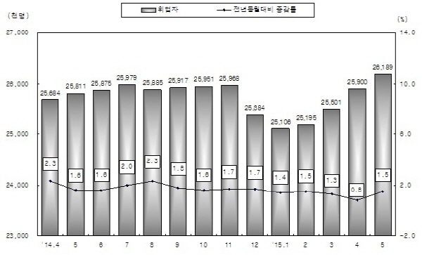 이는 산업별 숙박 및 음식업과 제조업 등에서의 취업자 규모 확대와, 지난해 4월 세월호 참사 여파로 인한 취업자 수 감소에 따른 영향으로 보인다고 통계청은 설명했다.