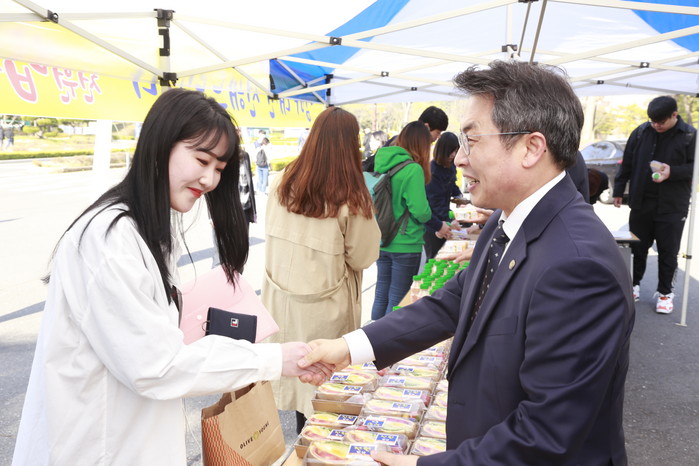 ▲군산대학교는 19일 오전 대학본부 앞 광장 일대에서 학생·취업지원처 주관으로 “2018 따뜻한 천원밥상” 행사를 실시했다. 곽병선 총장이 학생들에게 천원의 아침식사를 나누어주며 격려하고 있다.(군산대학교 제공) |
