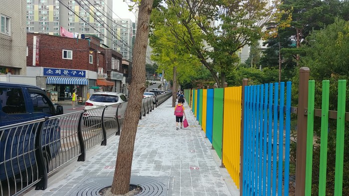 학교부지 활용한 통학로 조성사업은 보도설치가 어려운 주택가 골목길과 접하고 있는 초등학교 중 학교 구조와 도로와의 연결 가능성 등을 고려하여 학교담장을 뒤로 물리고 학교내 부지를 활용 기존 도로와 나란히 보도를 조성하는 사업이다.