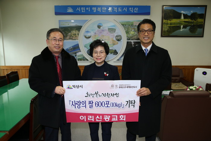 17일 익산시청 부시장실에서 이지영 부시장을 비롯한 오해근 목사 등이 참석한 가운데 기탁식이 열렸다. 이날 기탁된 쌀 600포는 노인종합복지관과 생활이 어려운 가정, 다자녀 가정에 지원될 예정이다.