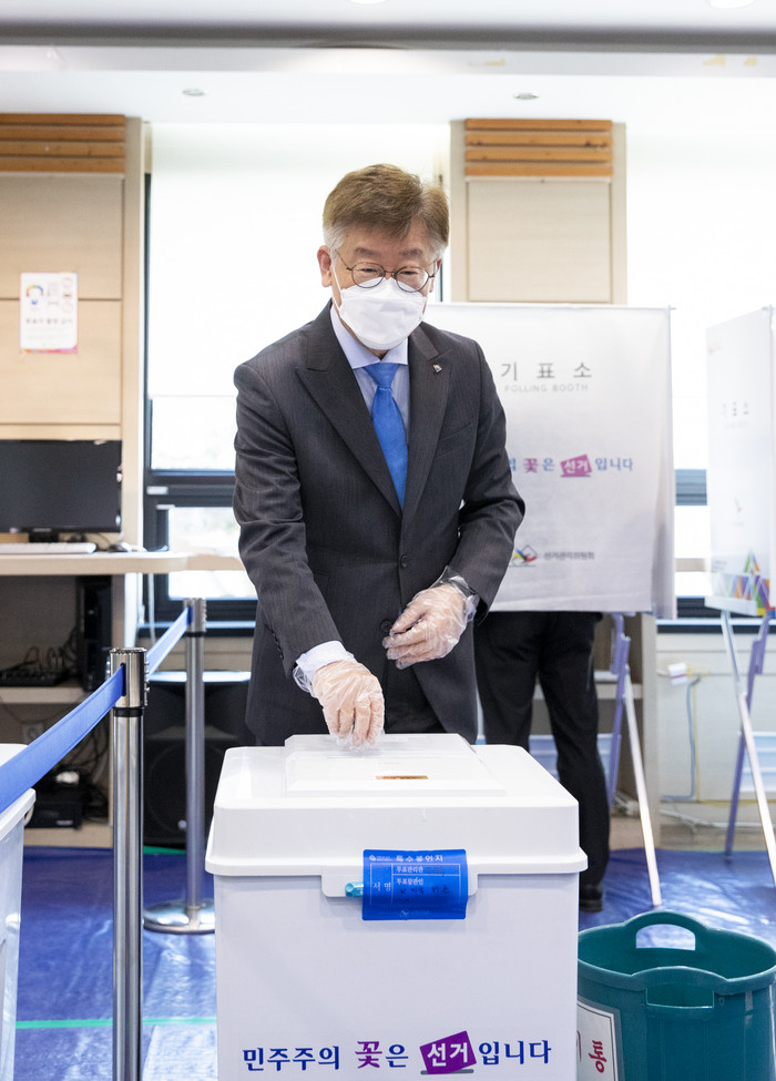 코로나19 상황에서 치러진 투표인만큼 이 지사는 마스크를 착용한 채 투표소 입구에서 발열체크를 했으며 투표소에 비치된 손소독제로 손을 소독한 뒤 위생장갑을 끼고 투표에 임했다.