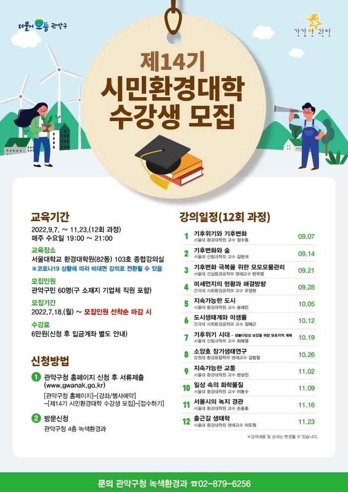 [로컬세계 = 임종환 기자] 서울 관악구가 서울대학교와 함께 지역주민에게 한 차원 높은 환경교육 콘텐츠를 제공하고자 제14기 ‘시민환경대학’을 운영한다고 14일 밝혔다.