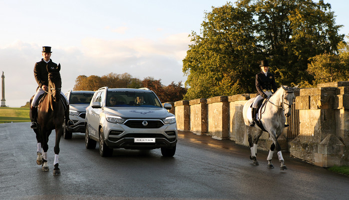 ▲G4 렉스턴이 에스코트를 받으며 유라시아 대륙횡단 종착지인 블레넘팰리스로 입장하고 있다. 쌍용차는 향후 3년 동안 메인스폰서로서 블레넘팰리스 국제승마대회를 후원하기로 하고 G4 렉스턴 차량을 전시했다. |