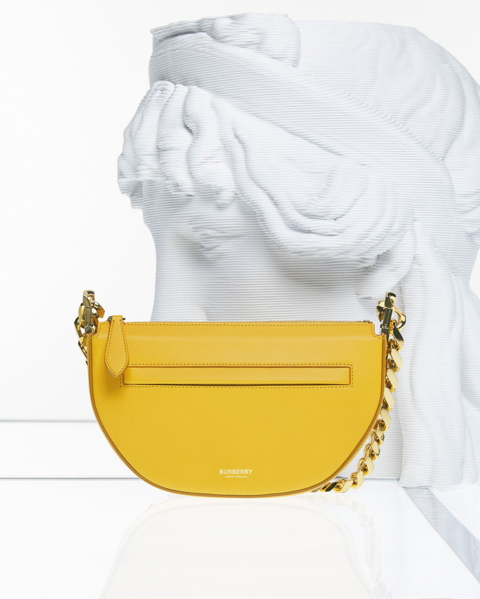 버버리의 대표적인 올림피아 백은 몸에 밀착되는 초승달처럼 휘어진 선명한 활 모양의 미적 아우라가 느껴지며, 클래식한 디자인에 현대적 감성을 불어넣은 가방으로 이탈리아에서 제작되고 소재는 매끄러운 가죽이 돋보인다.