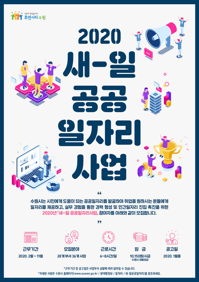 자세한 사항은 수원시 홈페이지 ‘분야별 정보→일자리→새-일공공일자리’에서 볼 수 있다.