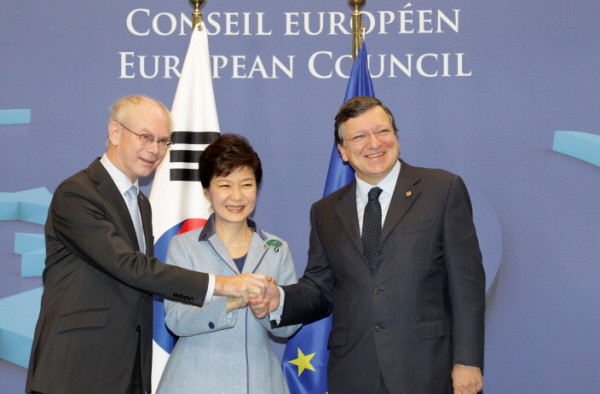 ▲ 지난 2013년 11월 벨기에를 방문한 박근혜 대통령이 유럽연합 이사회에서 조제 마누엘 바호주 EU 집행위원장 (오른쪽), 헤르만 반롬푀이 EU 정상회의 상임의장(왼쪽)과 한·EU 정상회담 기념촬영을 하고 있다.<사진출처=청 와대 홈페이지> |
