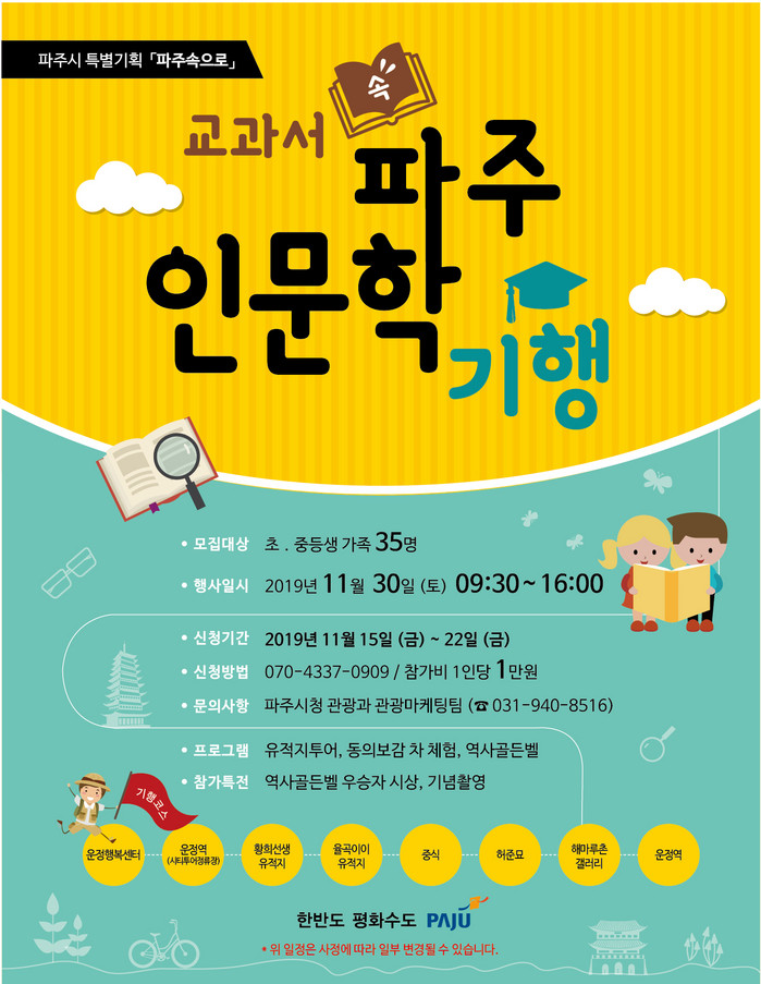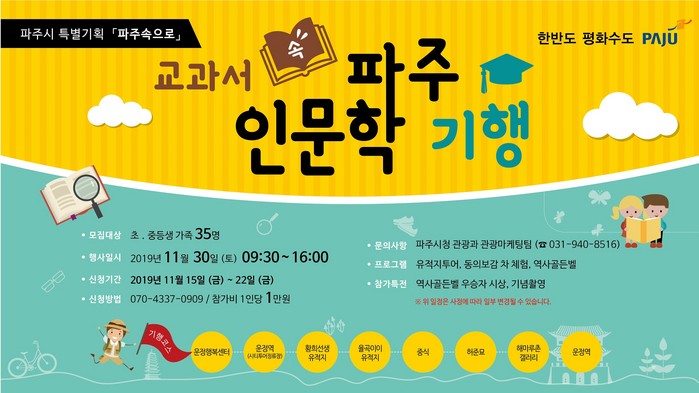 인문학기행에 파주시민 누구나 참여할 수 있지만 특히, 11월 인문학기행은 ‘교과서 속 파주 역사 이야기’로 진행돼 초·중등학교 학생들에겐 자연스럽게 교과서 역사 이야기를 접할 기회가 될 것으로 기대된다.