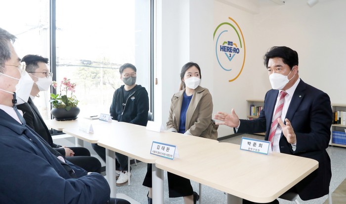 ▲지난 3월 창업지원시설에 방문해 입주기업과 간담회를 하고 있는 박준희 관악구청장. 관악구 제공 |