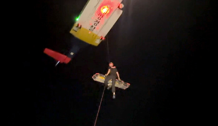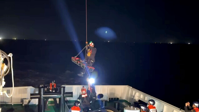 ▲ 해양경찰 경비함정에서 항공구조사가 호이스트를 이용해 환자를 헬기로 옮기고 있다. 남해경찰청 제공 |
