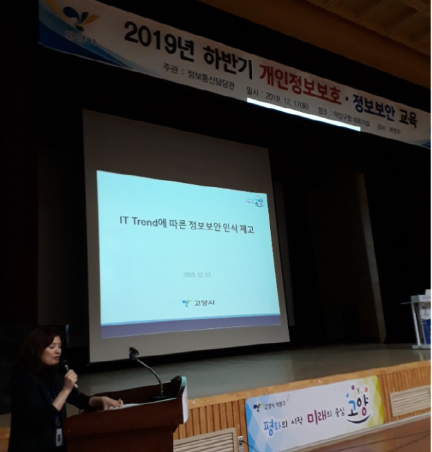이날 교육은 고양시 직원을 대상으로 ▲개인정보보호법 주요 내용 및 위반사례 ▲정보보안 규정 및 정보보호의 생활화 ▲최근 IT 트랜드와 정보보호 시사점 등에 대해 알아보는 시간으로 이뤄졌다.