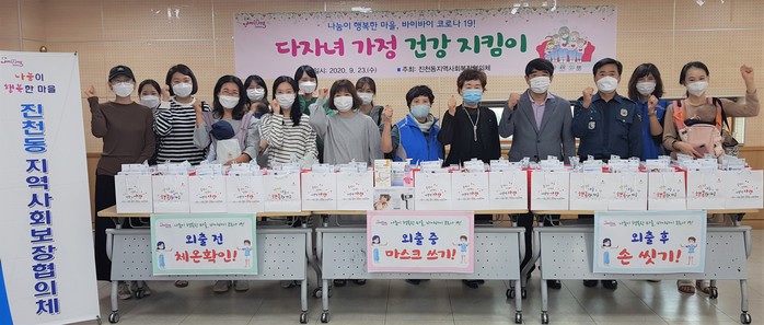 진천동 지역사회보장협의체는 최근 코로나19로 개인위생의 중요성이 강조되고 방역에 취약한 어린자녀를 둔 다자녀가정에 건강 지킴이 3종(비접촉 체온계, 비말차단 마스크, 손 세정제)을 배부하고 개인 방역 수칙 준수 실천결의를 다지는 시간을 가졌다.