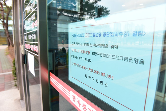 | ▲지난 2월 초 장안구민회관 입구에 게시된 프로그램 운영 중단 안내문. |