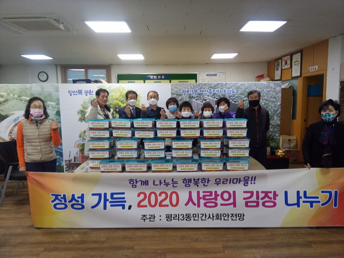 [로컬세계 박세환 기자]대구 서구 평리3동 민간사회안전망(위원장 황순덕)은 지난 29일 평리3동행정복지센터에서 ‘2020 사랑의 김장 나누기 행사’를 개최하고 관내 저소득 가정에 김장김치 5Kg 60박스를 60세대에 전달했다.