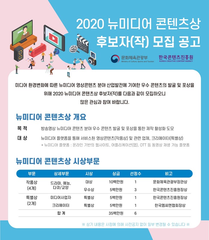 문화체육관광부와 한국콘텐츠진흥원(원장 김영준, 이하 콘진원)은 방송영상 뉴미디어 분야의 우수 방송콘텐츠를 발굴하고, 이를 포상하기 위한 ‘2020 뉴미디어 콘텐츠상’ 후보자(작)를 오는 13일까지 추천 받는다.