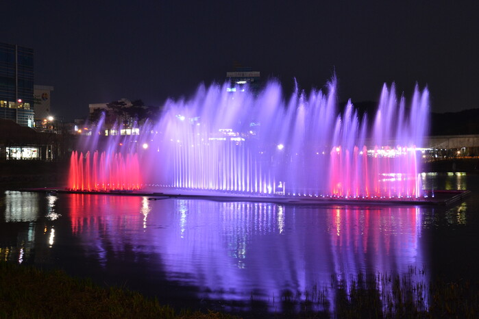 다양한 장르의 음악에 맞춰 화려한 LED 조명에 맞춰 솟아오르는 시원한 물줄기를 내뿜는 음악 분수는 동백호수공원의 상징이다.