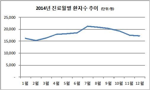 월별 분포율을 살펴보면 날씨가 더워지며 다래끼로 병원을 찾는 환자가 늘어나기 시작해 7~9월에 가장 많았고 이후 점차 줄어 1~3월에 가장 적었다.