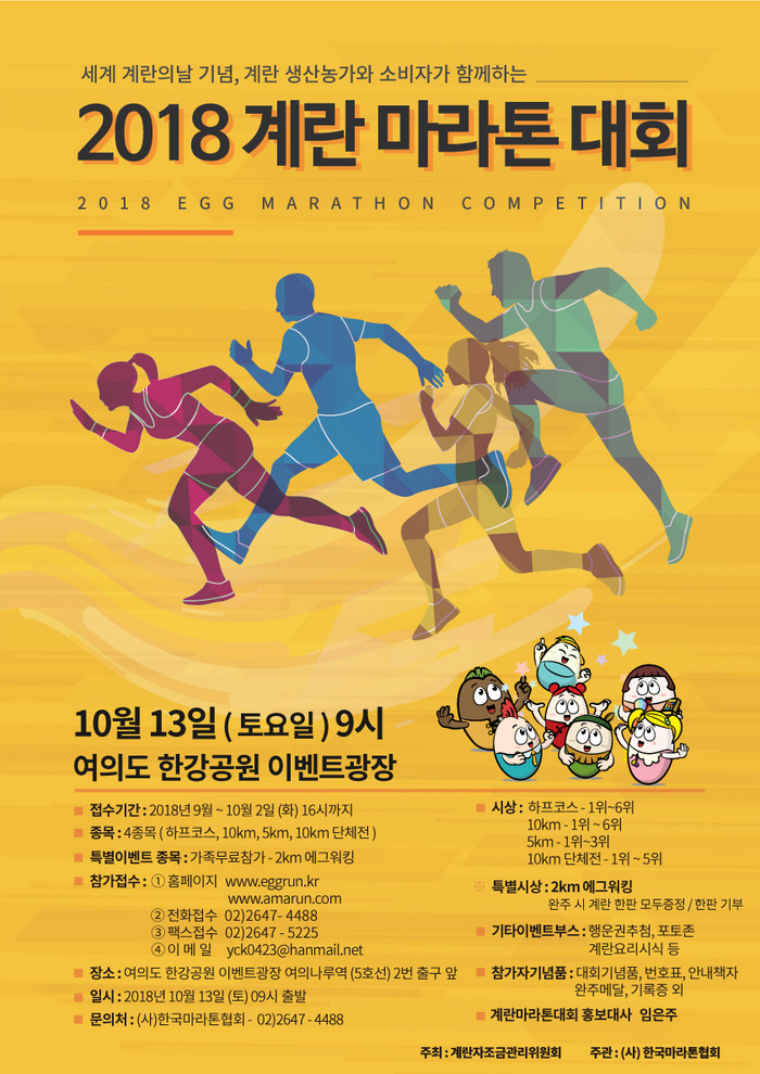 [로컬세계 이명호 기자]계란자조금관리위원회(위원장 남기훈)는 오는 10월 13일 서울 여의도 한강공원 이벤트 광장에서 ‘2018 계란마라톤대회’를 개최한다고 1일 밝혔다.
