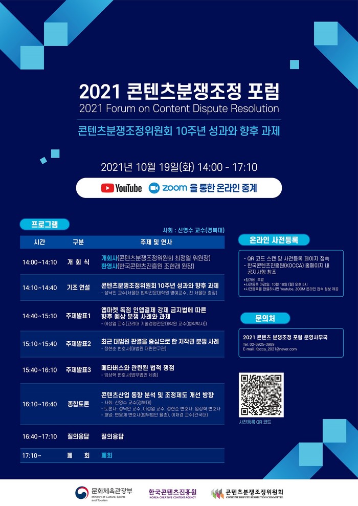 ‘2021 콘텐츠분쟁조정 포럼’은 코로나19 확산 방지를 위해 비대면 온라인 방식으로 진행되며, 콘진원 공식 유튜브를 통해 19일 오후 2시부터 생중계한다. 포럼에 대한 자세한 내용은 콘진원 누리집 공지사항을 통해 확인할 수 있다.