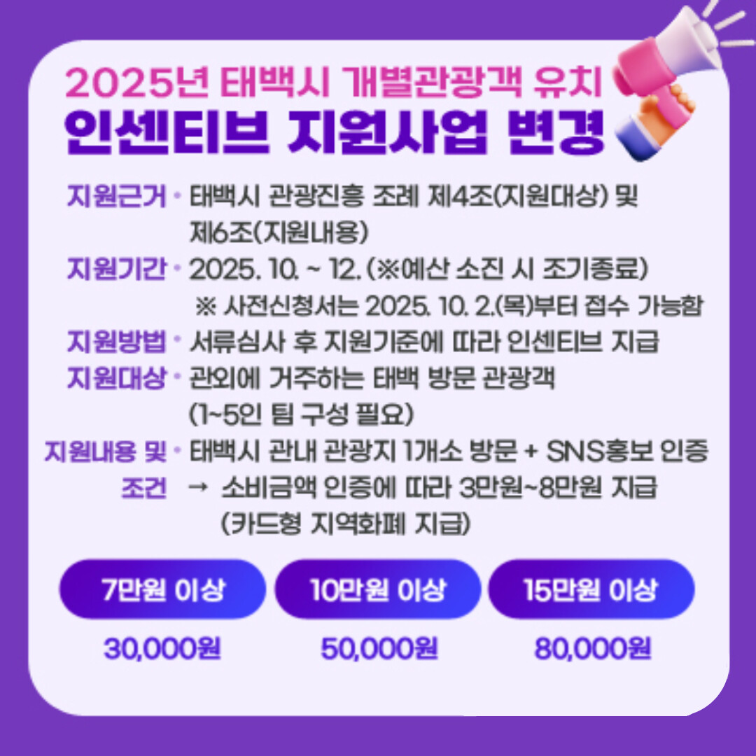 한편 ‘2025년 개별 관광객 인센티브 지원사업’ 세부 지원내용 및 신청조건은 태백시청 문화관광과로 문의하거나, 태백시청 홈페이지 고시/공고 게시판에서 확인할 수 있다.
