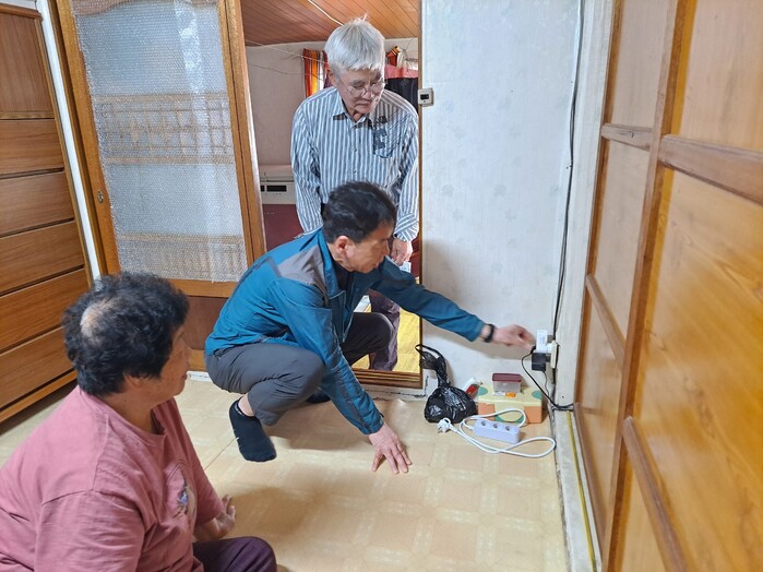 ▲의성군 사곡면 지역사회보장협의체가 지난 3일 취약계층 1인가구 위기상황 예방을 위해 안심 돌봄 플러그 설치사업을 하고 있는 모습(의성군 제공) |