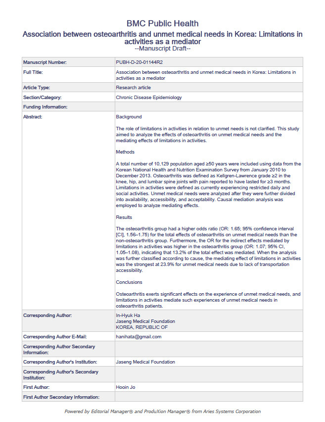 ▲‘BMC Public Health’ 2020년 6월호에 게재된 해당 연구 논문 「Association between osteoarthritis and unmet medical needs in Korea: Limitations in activities as a mediator」 |