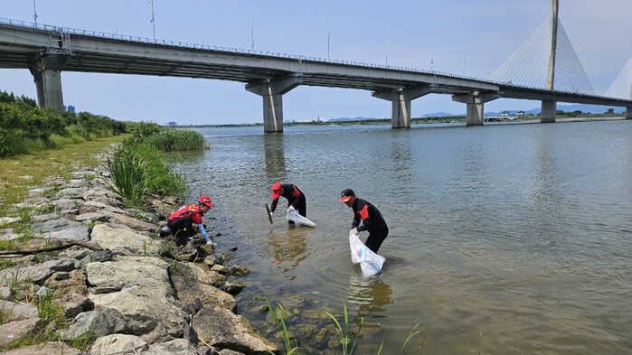 이날 해병대전우회 북구지회 회원 30여 명은 덕천배수장 부근 낙동강 수중 쓰레기를 수거하고, 주위 보행길을 따라 걸으면서 무단투기된 생활 쓰레기 1,000L가량을 수거하였다.
