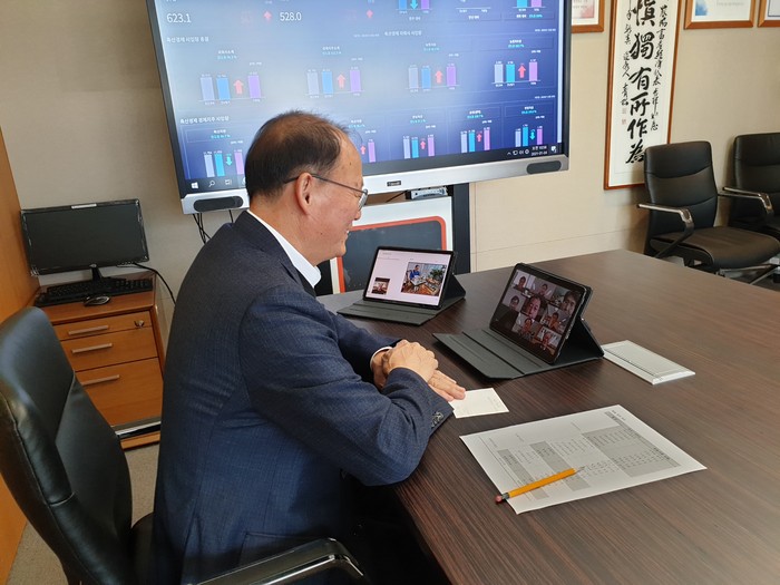 | ▲비대면 간담회를 진행하고 있는 농협 김태환 축산경제대표이사. |