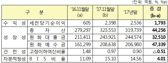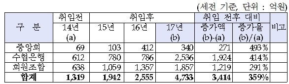 3년 사이 수익은 세배 늘었고 자기자본도 두배 가량 증가하는 등 수익성과 건전성이 대폭 개선되면서 지난해 회원조합 가운데 99%가 흑자를 달성하는 성과를 이뤘다.