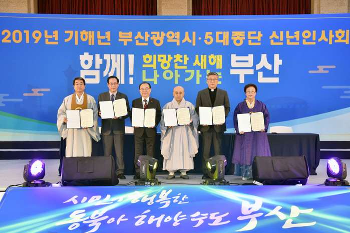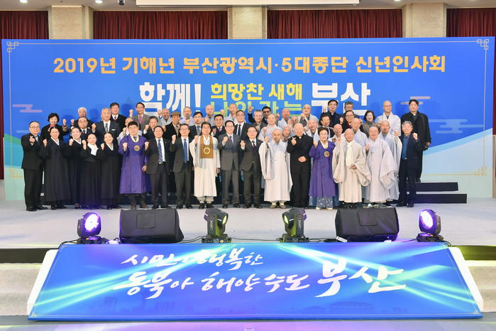 11일 오후 부산시청 대강당에서 열린 5대 종단 합동 신년인사회에서 5대 종단 대표자들이 새해 인사를 위해 한 자리에 모인 것은 이번이 처음이다.
