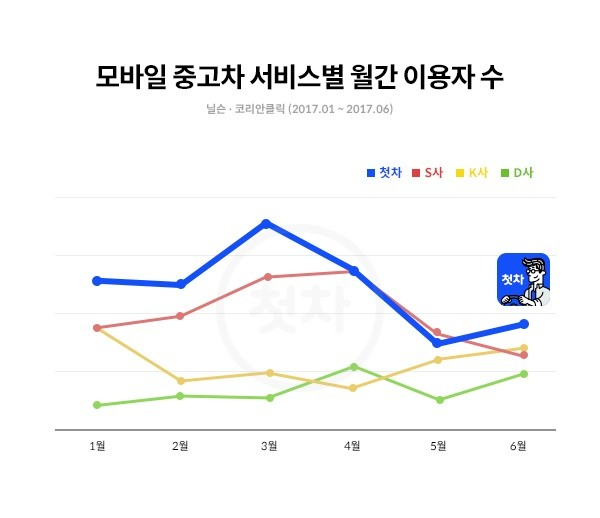시장 조사 전문업체 닐슨코리안클릭이 집계하는 모바일 앱 이용자 데이터에 따르면 첫차는 2017년 1분기 3개월 연속으로 월간 이용자 수 1위를 기록했으며, 1월부터 6월까지의 상반기 월간 이용자 수를 합산할 경우에도 2위 서비스보다 약 20.4% 높은 수치를 보였다.