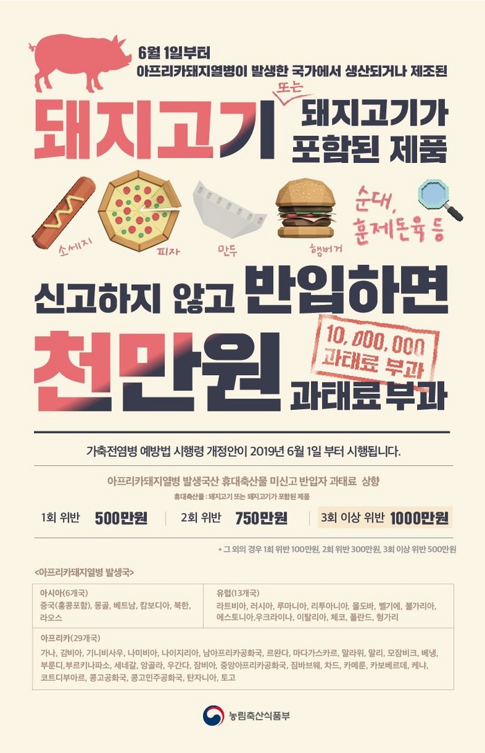 아울러 중국(홍콩 포함), 몽골, 베트남, 캄보디아, 라오스 등에서 아프리카 돼지열병이 지속적으로 발병하고 있는 점을 감안해 국내에 소세지, 만두, 순대, 육포 등 축산물 가공품을 절대 반입하지 말아 줄 것을 요청했다.