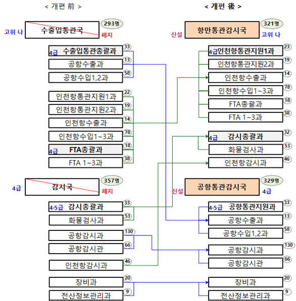 개편안에 따르면 그동안 인천세관에서 운영되던 수출입통관국과 감시국은 모두 폐지되고 항만통관감식국과 공항통관감시국이 신설돼 기존의 역할을 맡는다.