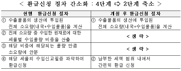 개정안은 평균납부세액을 계산하기 위해 별도의 인력과 시간을 투입해야하는 만큼 중소기업에 대해서는복잡한 조정 절차등을 생략하고, 원재료 수입 시 납부한 세액 범위 내에서 관세를 간편하게 환급받을 수 있도록하고 절차를 4단계에서 2단계로 대폭 축소했다.
