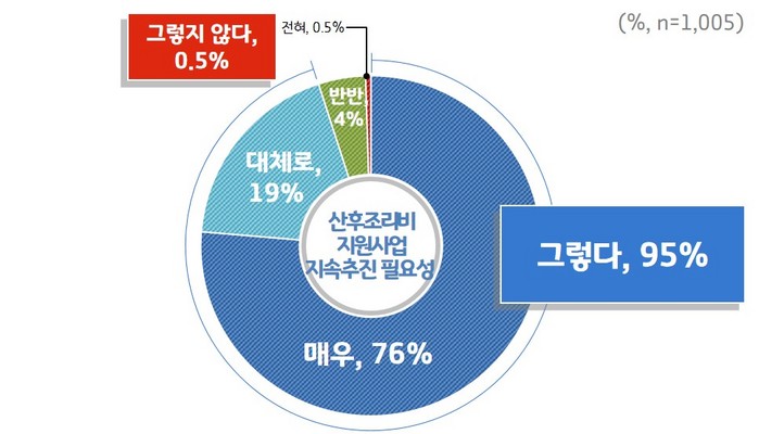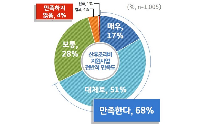 조사결과에 따르면 산후조리비 지원사업에 대해 ‘전반적으로 만족한다’는 응답은 68%(매우 만족 17%, 대체로 만족 51%)로 나타났으며, ‘보통이다’는 28%, ‘만족하지 않는다’는 응답은 4%였다.