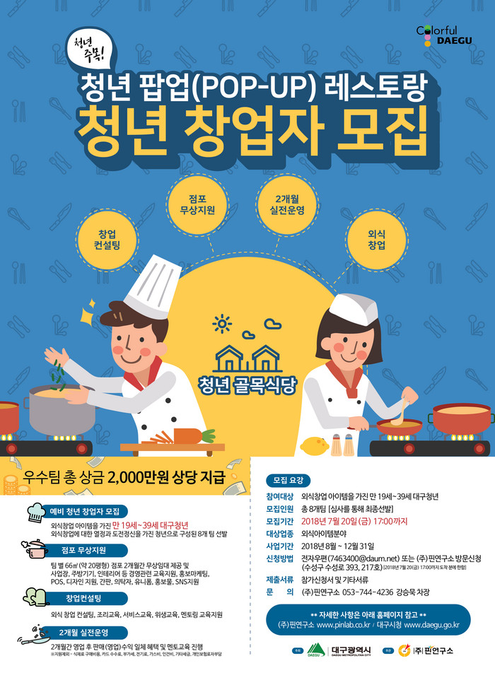 참가대상은 외식창업을 하고자 하는 대구거주 청년(19세~39세)으로 4명 이상 팀을 구성해 신청하면 된다. 7월 말 오디션을 통해 최종 참가자 8팀을 선발해 8월부터 2개월간 실제 운영에 들어간다.