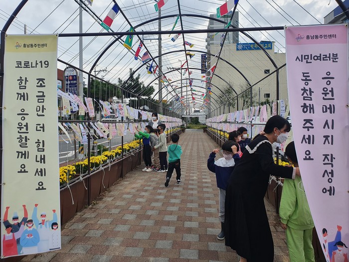 흥남동은 여름철 주민쉼터의 일환으로 주민센터 앞에 설치돼 있는 그린터널에 코로나로 어려운 현 상황을 함께 응원하며 극복해 나가자는 의미의 응원메시지 게첨을 진행했다.