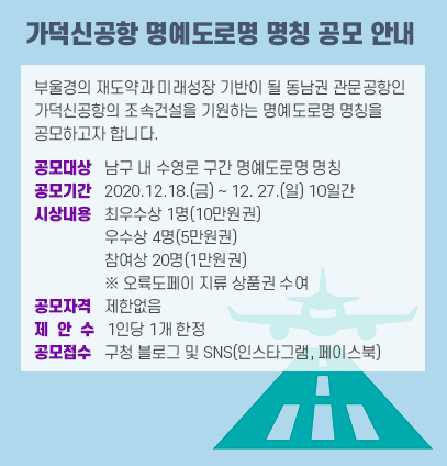 [로컬세계 맹화찬 기자]부산 남구(구청장 박재범)는 가덕신공항 조속 건설을 기원하기 위해 남구 내 수영로구간 3.65㎞(대남교차로→문현교차로)에 명예도로명을 부여할 계획이며 이에 따라 오는 18~27일까지 10일간 명예도로명 명칭을 공모한다.