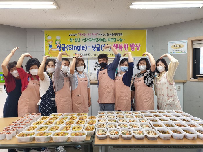 [로컬세계 박세환 기자]대구 서구 비산2.3동 마을복지계획단에서는 지난 24일 마을공유부엌 함성에서 추석 명절을 맞아 복지사각지대 우려가 있는 청장년 1인가구 및 싱글대디 가구 25세대에 소불고기, 전, 열무김치 등 ‘싱글(single)싱글 행복한 밥상’ 반찬을 전달했다.