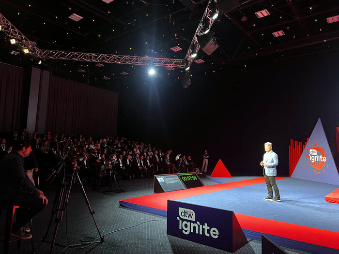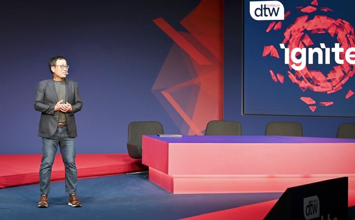 ▲현지시간 기준 19일 코펜하겐에서 열린 TM포럼 주관 ‘DTW Ignite’ 행사에서 SKT 정석근 글로벌/AI 테크 사업부장이 기조연설 하는 모습. SKT 제공 |