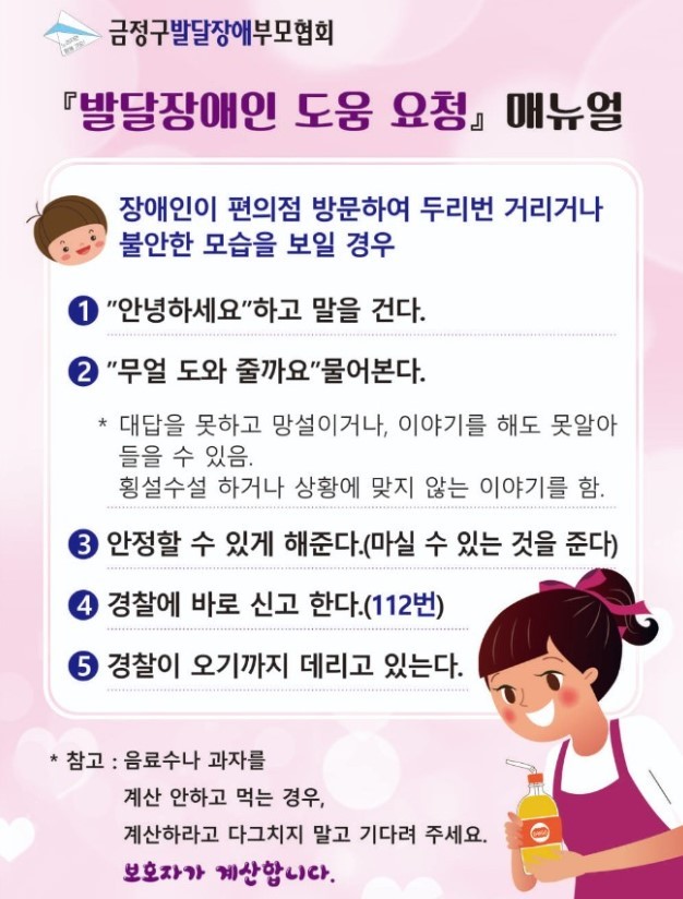 금정구는 지난 2017년 9월 부산에서 최초로 발달장애인 권리보장 및 지원에 관한 조례를 제정했으며 이를 근거로 구 자체 예산을 편성, 발달장애인에 대한 지역주민의 이해도를 높이고자 발달장애인 부모가 직접 참여하는 홍보캠페인을 활발히 이어나가고 있다.올해 홍보캠페인은 지난 7월 발달장애인 지원위원회 심의 회의를 거쳐 발달장애 당사자 및 부모가 직접 참여하기로 결정, ▲발달장애인 옹호가게 발굴 및 스티커 부착 ▲발달장애인 대처매뉴얼 자체 제작 및 배부 ▲코로나19로 인한 방역물품(마스크) 전달 등의 내용으로 8월부터 12월 초까지 금정구 지역 곳곳에서 활발한 활동을 전개하고 있다.