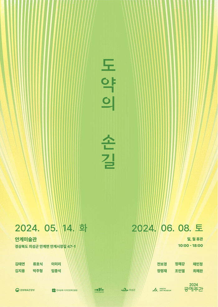 이번 프로그램은 안계미술관과 안계행복플랫폼 일대를 배경으로 오는 14일부터 6월 8일까지 공예작가 12인의 전시와 더불어 지역주민 대상 △공예 체험 워크숍 △찾아가는 경로당 공예 체험 프로젝트를 마련해 농촌지역의 주민에게 일상에서 공예문화를 체험할 수 있는 기회를 제공하고 공예작가에게는 의성군을 예술활동의 배경으로 제공한다.
