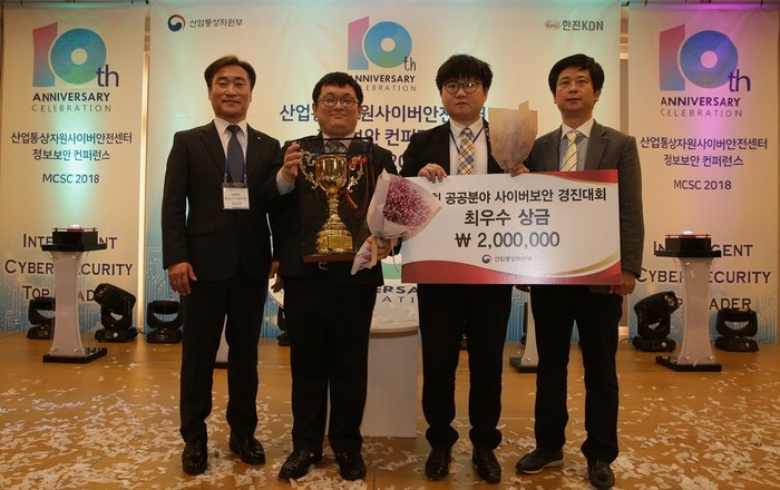 | ▲사이버보안 경진대회 최우수상을 차지한 강원랜드 직원들(왼쪽에서 첫번째, 두번째)이 수상자들과 기념사진을 찍고 있다. |