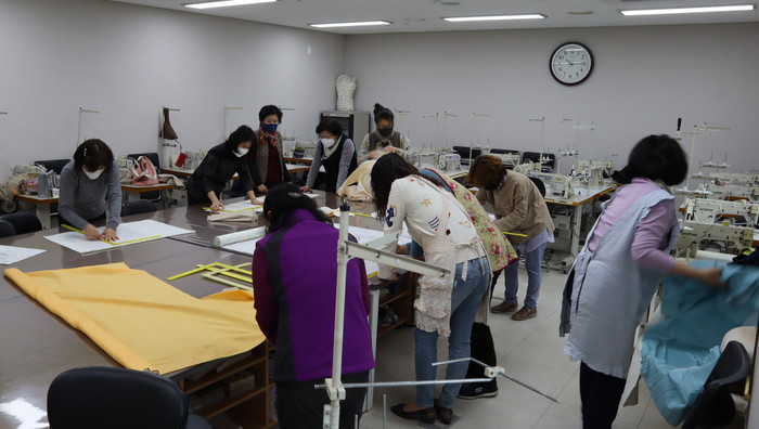 본격적인 마스크 제작은 지난 10일부터 복지관 내 양재교육장 등에서 시작됐다. 1일 20명씩 투입돼 재단, 미싱, 끈 부착, 실밥 제거, 다림질, 소독, 포장을 거쳐 한 주당 약 5000매가 생산될 예정이다.