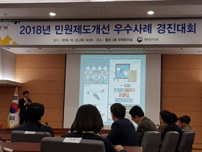 | ▲관세청은 지난 23일 행정안전부 주관 ‘2018년 국민생활밀접 민원제도개선 우수사례 경진대회’에서 직구물품 환급제도에 대한 지침을 발표하고 있다. |