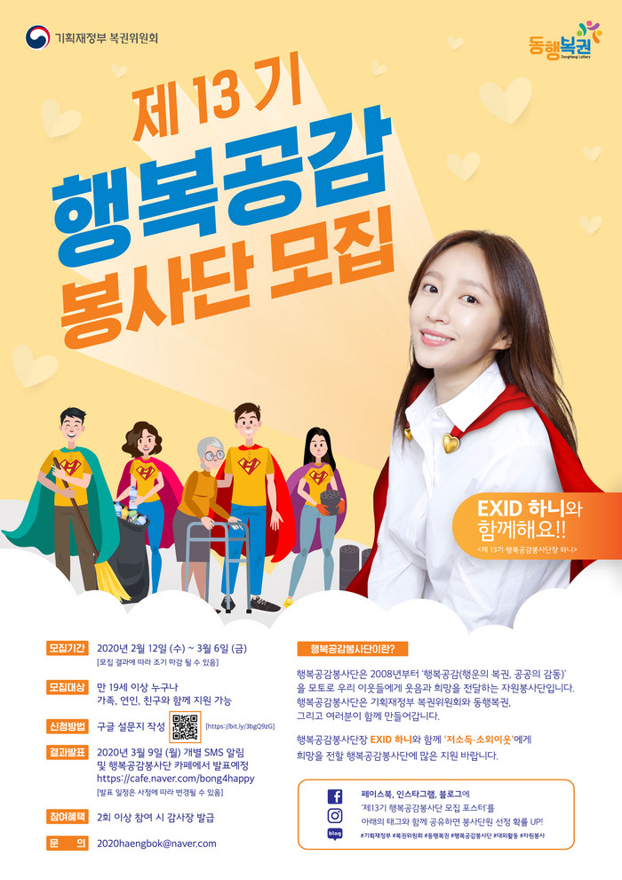 한편 복권 홍보대사 및 제13기 행복공감봉사단장에는 가수 EXID 멤버 겸 배우 하니가 임명됐다. 하니는 단원들과 봉사활동을 함께 하며 따뜻한 마음을 나누고 희망을 전하는 데 앞장설 예정이다.