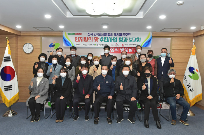 [로컬세계 박세환 기자]대구 남구청은 지난 4일 남구청 2층 회의실에서 계명문화대학교 산학협력단 및 안지랑 곱창골목 상가번영회 등 20여 명이 참석한 가운데 전국 곱창요리 레시피 공모전 ‘안지랑의 맛’ 사업 성과 보고회를 개최했다고 8일 밝혔다.