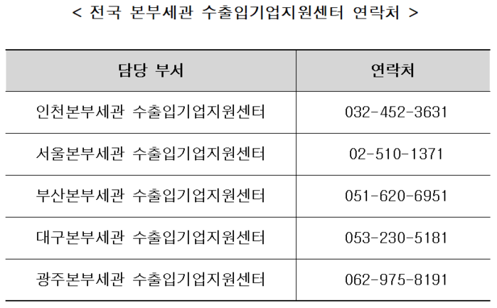 | ▲전국 본부세관 수출입기업지원센터 연락처.(관세청 제공) |