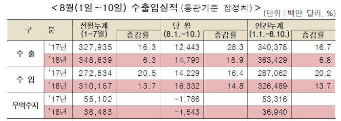 일평균 수출액은 17.4억 달러로 지난해 같은 달 대비 18.9% 올랐다. 이 기간 조업일수는 8.5일로 지난해와 같은 날을 고려한 수치다.