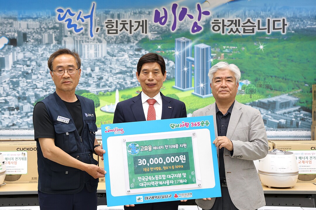 [로컬세계 = 박세환 기자] 대구시 달서구는 지난 4일 구청 2층 대강당에서 성서종합사회복지관, 전국금속노동조합 대구지부, 대구지역 관계 사용자 17개사와 함께 기후위기 대응과 취약계층 삶의 질 향상을 위한 ‘고효율 에너지 전기제품 교체 전달식’을 개최했다.